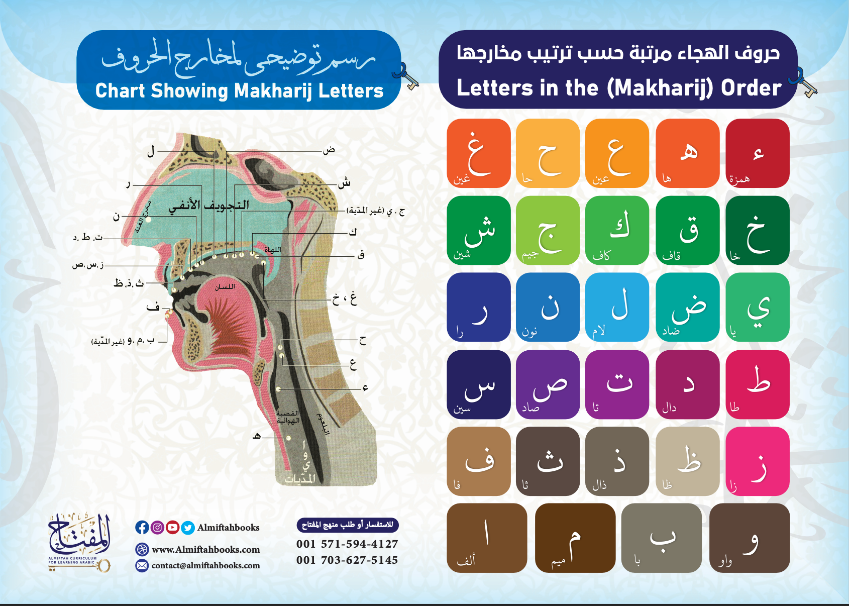 Improve Arabic language pronunciation with this Letters in the Makharij Order chart. A perfect tool for language learners to quickly and accurately learn and understand the makharij of letters. The chart includes the exact order of letters and where the sounds of the letters come from, making it easy to apply and improve pronunciation.